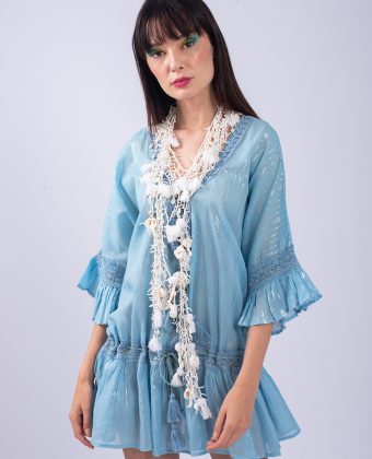 ΚΟΝΤΟ ΦΟΡΕΜΑ ΜΕ ΒΑΘΙΑ V-ΛΑΙΜΟΚΟΨΗ ΣΤΟΛΙΣΜΕΝΗ ΜΕ ΔΙΑΚΟΣΜΗΤΙΚΗ ΤΡΕΣΑ ΚΑΙ ΚΟΡΔΟΝΙ ΜΕ ΦΟΥΝΤΕΣ