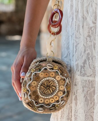 WOVEN MAT AND FABRIC SHOULDER BAG WITH BUTTON FOR CLOSING