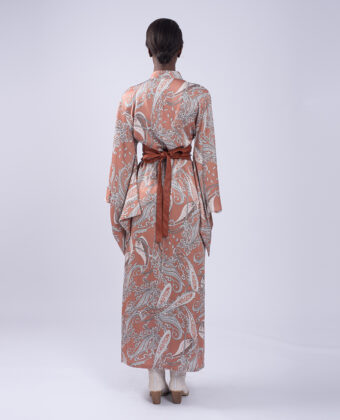 A LONG V -NECK KIMONO/WRAP DRESS WITH AN ALL OVER PRINT, A...