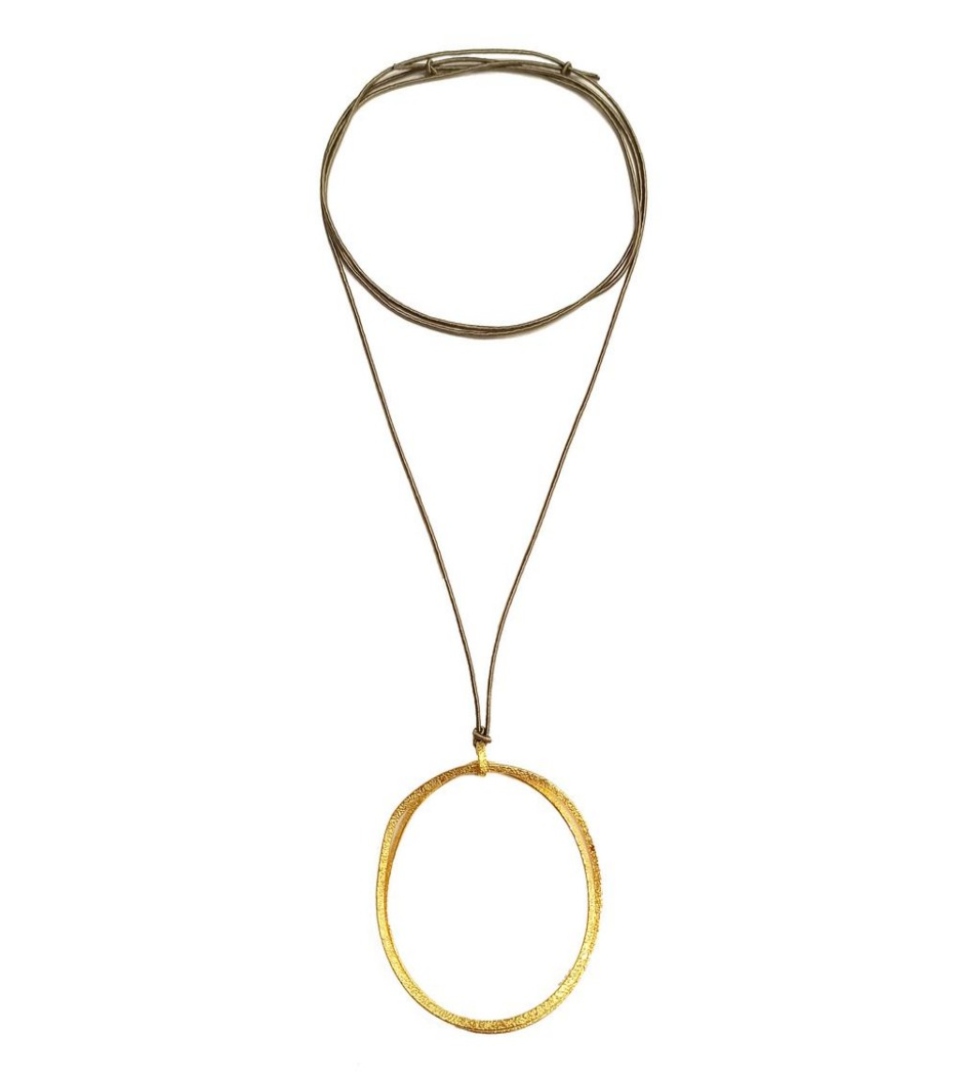 HANDMADE CORD NECKLACE WITH A BIG CIRCLE PENDANT IN GOLD PLATED BRONZE