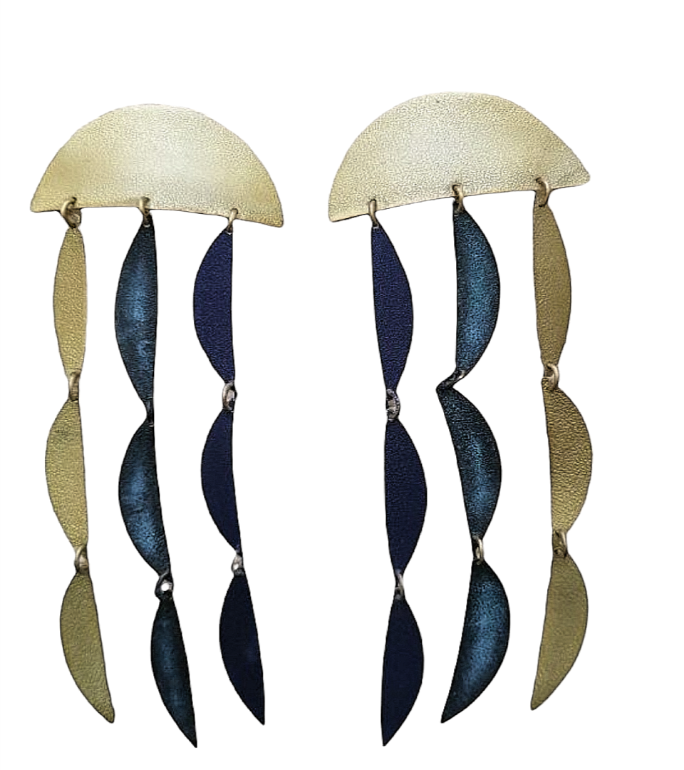HANDMADE HANGING BRASS EARRINGS IN GOLD COLOUR, BLUE ACRYLIC COLOUR AND OXYDIZED TURQUOISE COLOUR,HYPERALLERGENIC, NICKEL/LEAD FREE