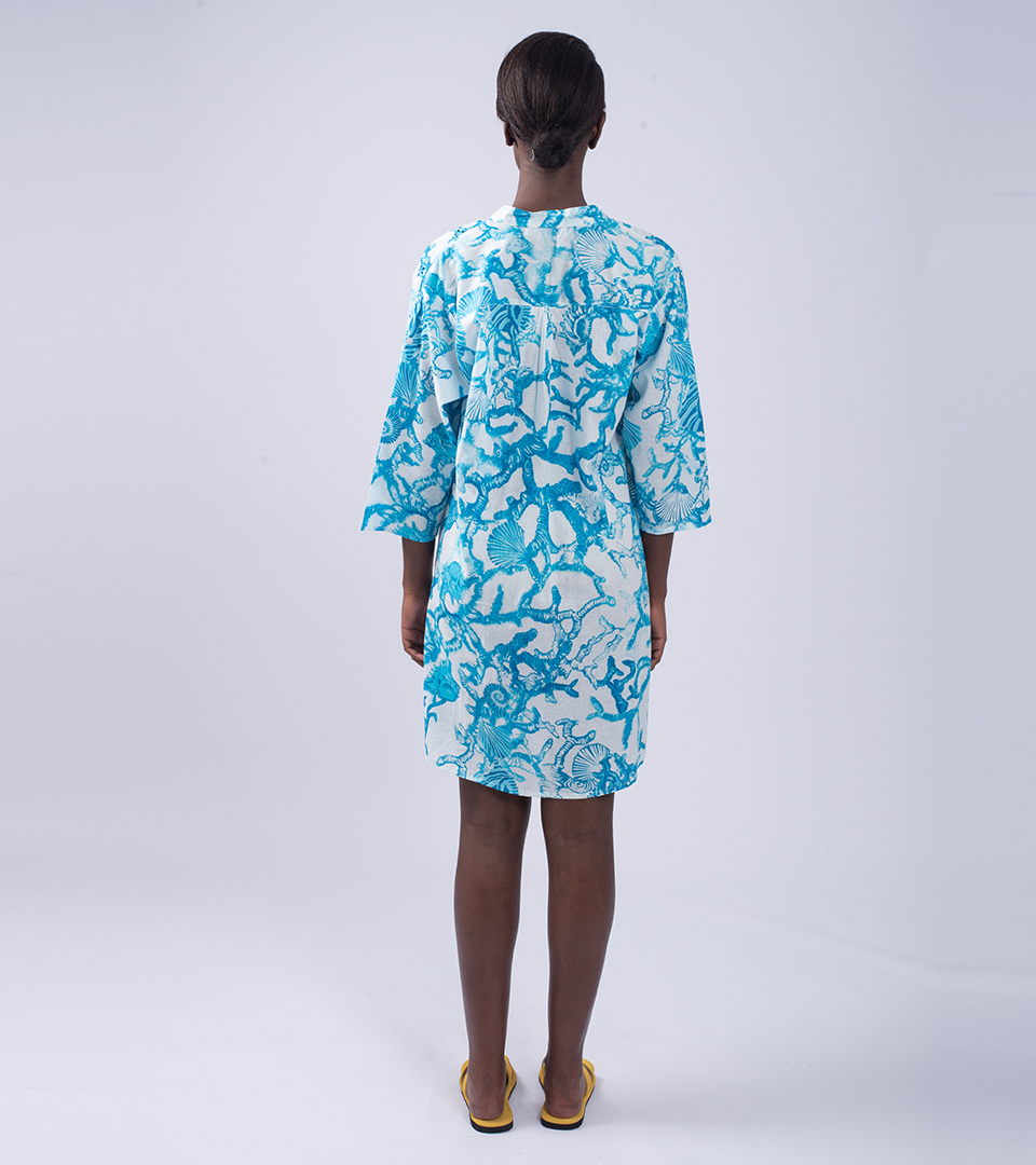 A MIDI LONG ALL OVER PRINT COTTON DRESS WITH AN EYELET LACE AND BUTTONS IN FRONT, IT HAS A V-NECKLINE WITH PLEADED PARTS ON THE CHESTLINE AND 3/4 SLEEVES